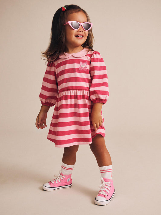 STRAWBERRY STRIPE PUFF SLEEVE DRESS - STRAWBERRY ALMOND MILK