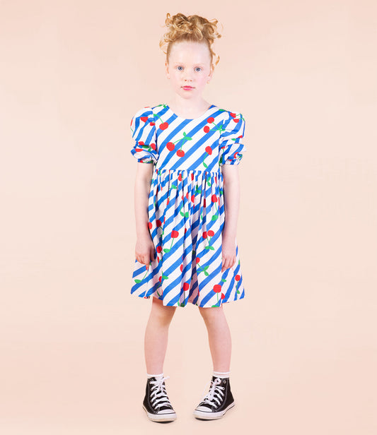 CHERRY STRIPES PUFF SLEEVE DRESS