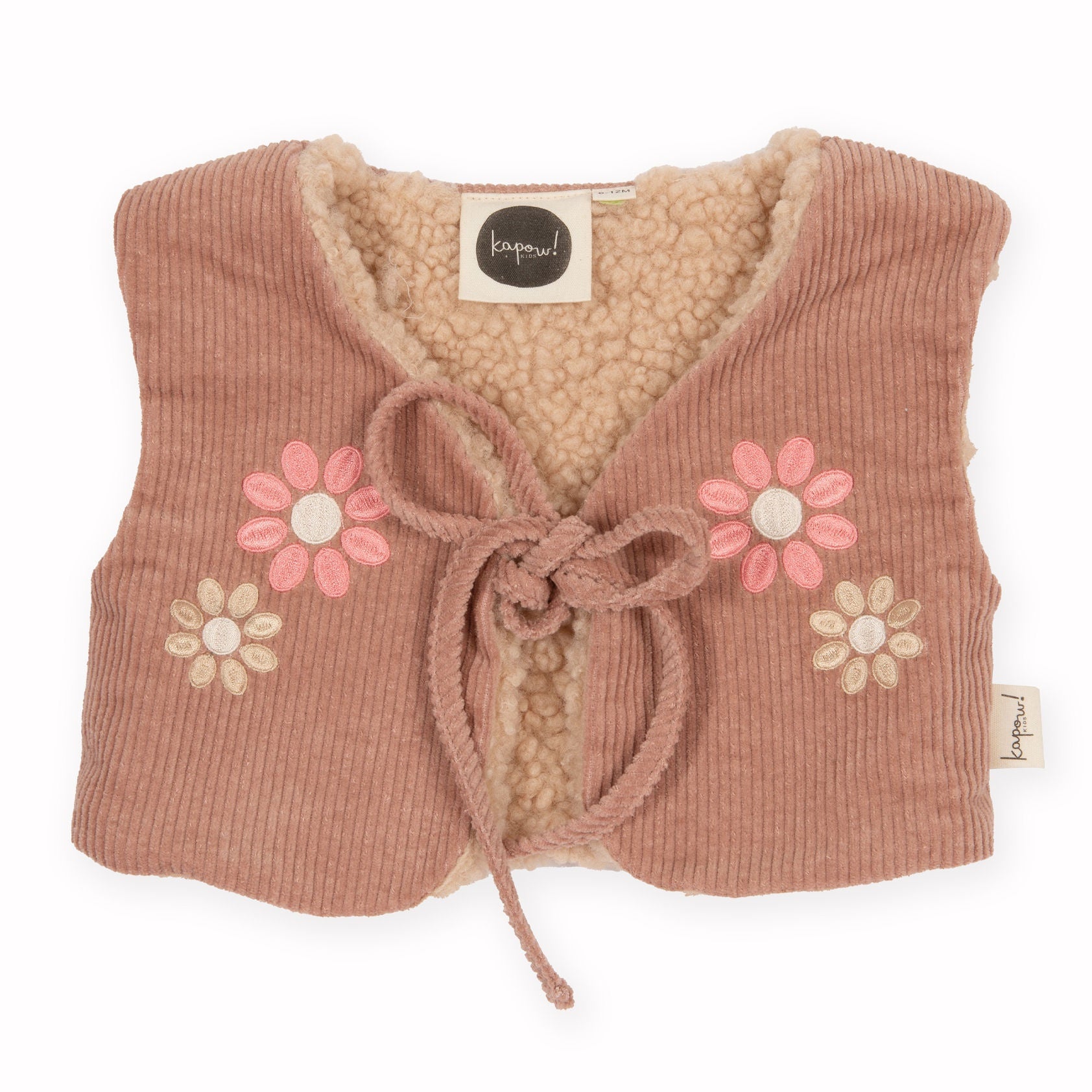 This sweet vest is in a rose taupe corduroy fabric vest has a cute flower embroidery and is lined with teddy fleece.