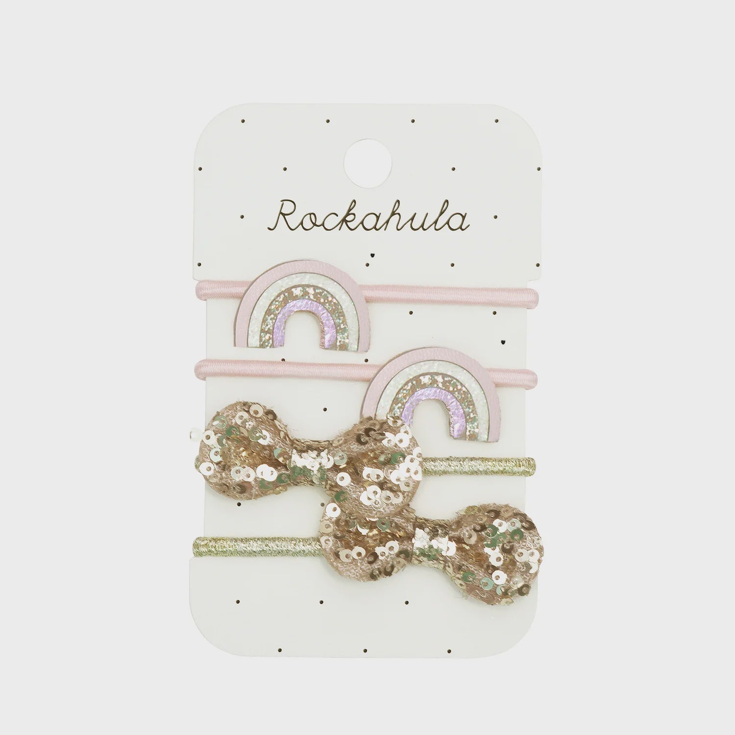 Fall under our magical spell and discover a world of enchantment with our shimmering rainbow ponies. This set of four ponies, include two rainbows made from the softest colour palette and two gold sequin bows.