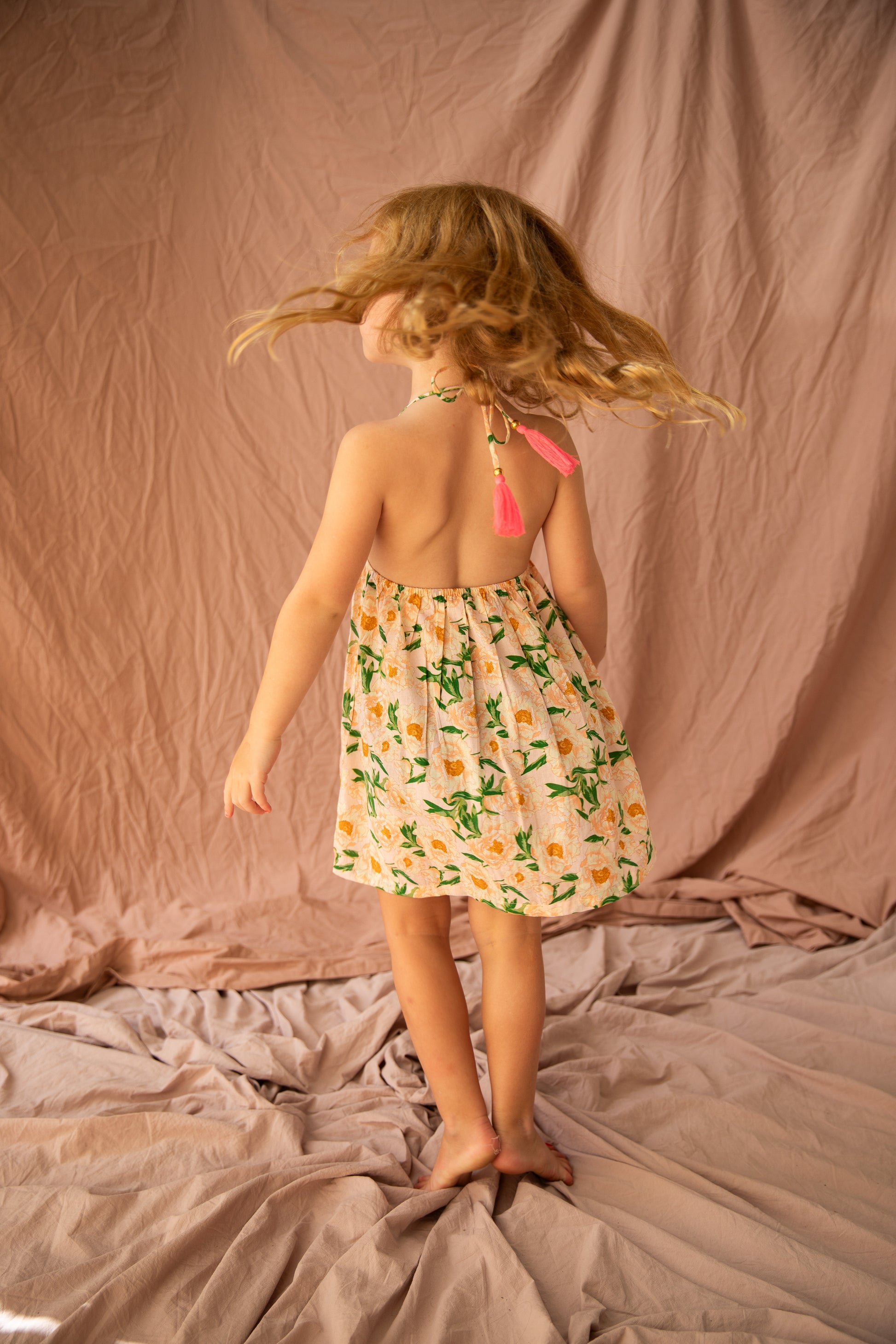 Breezy and cool all through summer, the Evie Dress has garden parties and park strolls covered. In our stunning Soiree Bouquet print on light cotton voile, set off with neon tassel ties. In case you missed it, her frill front panel matches back with the Freya baby romper for expert level sister dressing.