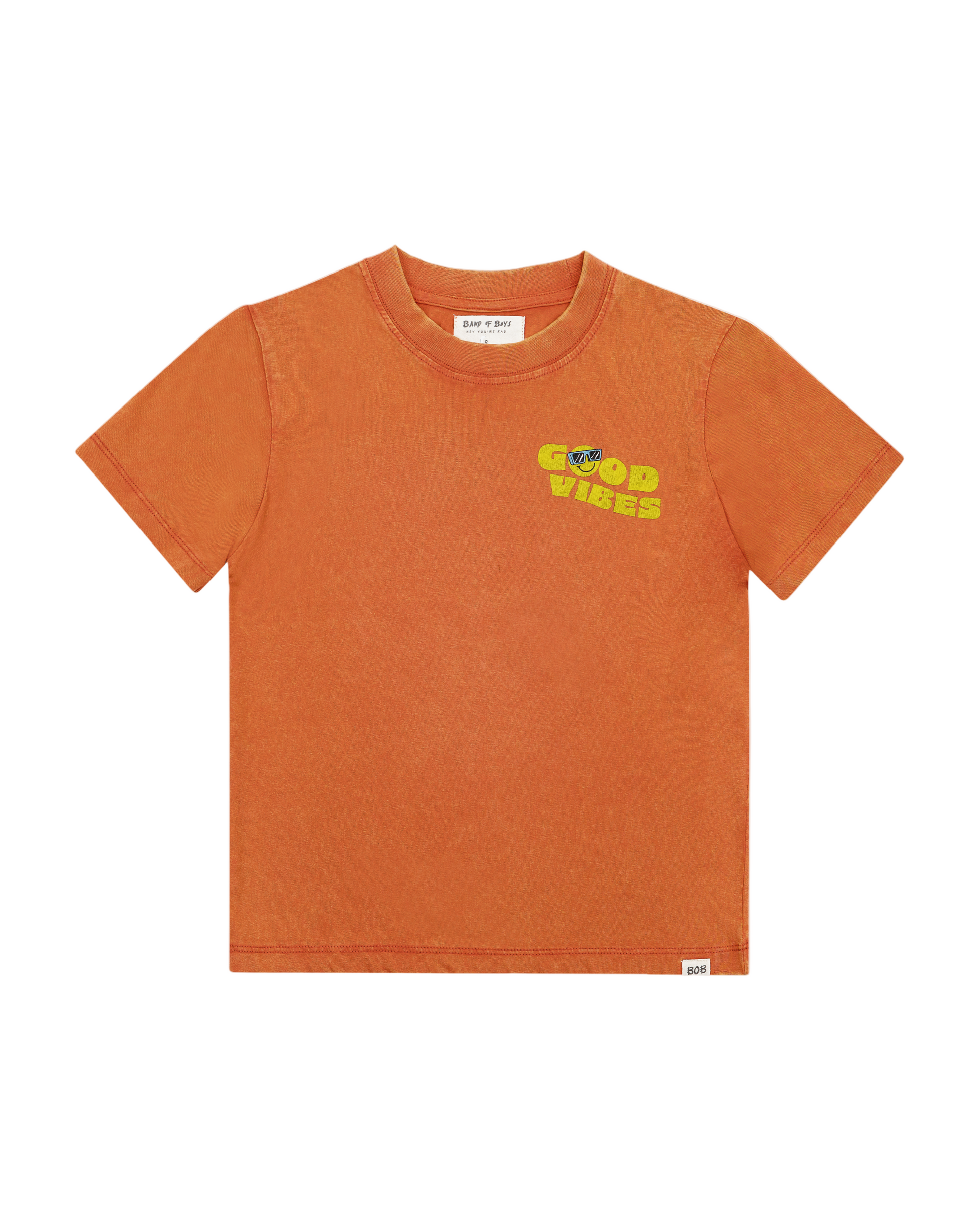 The Band of Boys Washed Orange Good Vibes Guy Tee is made for minis who like to stand out and keep it fun. With a vintage 'worn-in' back graphic, a smaller hit on the front, and that soft orange wash, this tee brings it all.