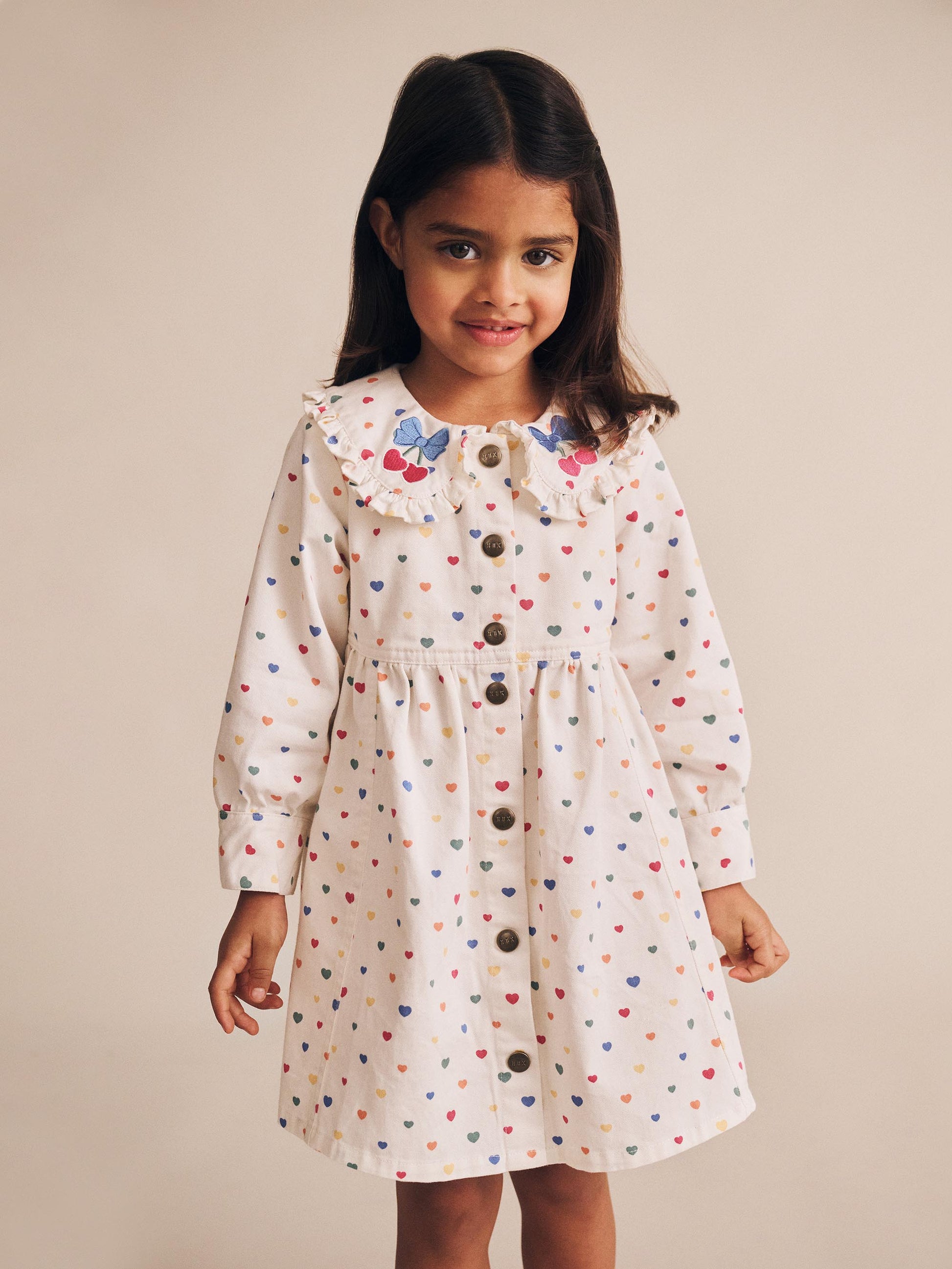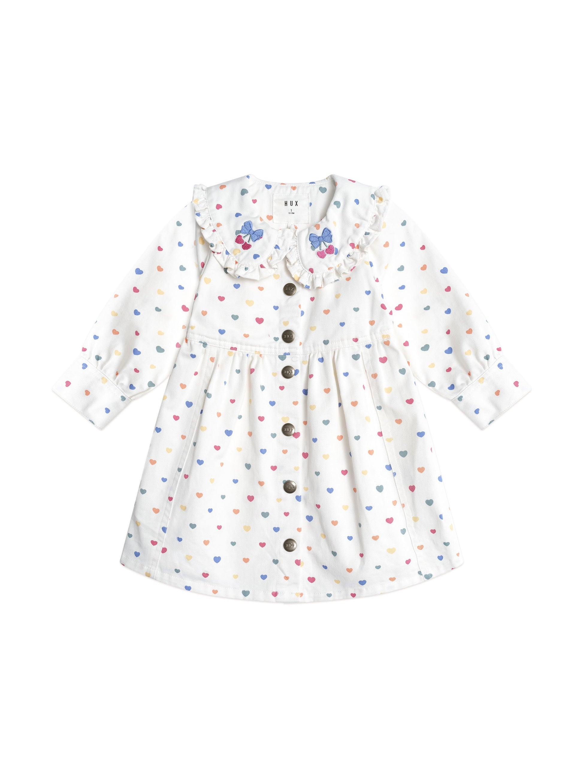 It’s the vanilla sprinkles dress of the season! Made from 100% cotton twill, it features a peter pan style frilly collar with embroidery detail, button down snaps, a full, tiered skirt and exaggerated puff sleeves.