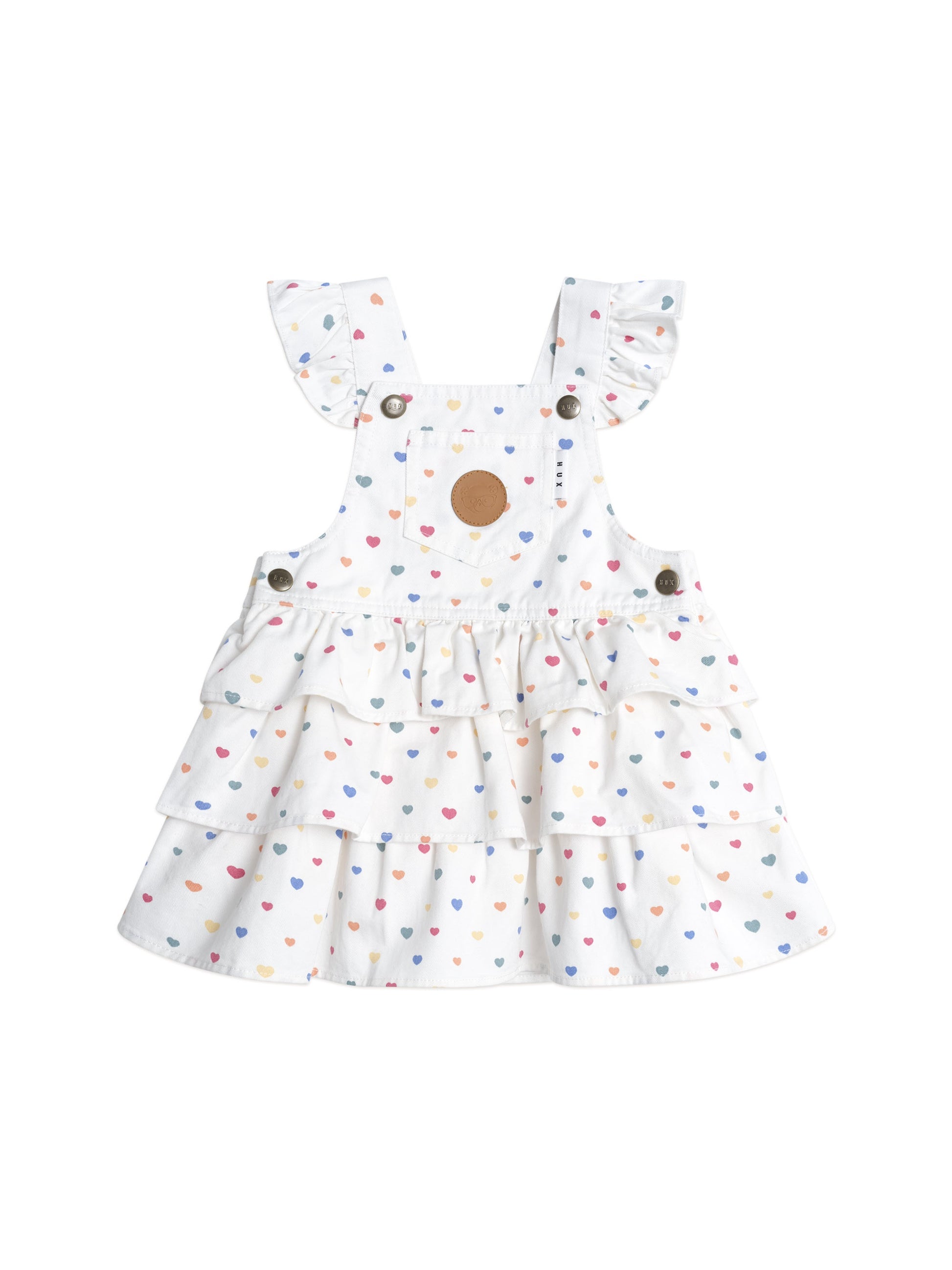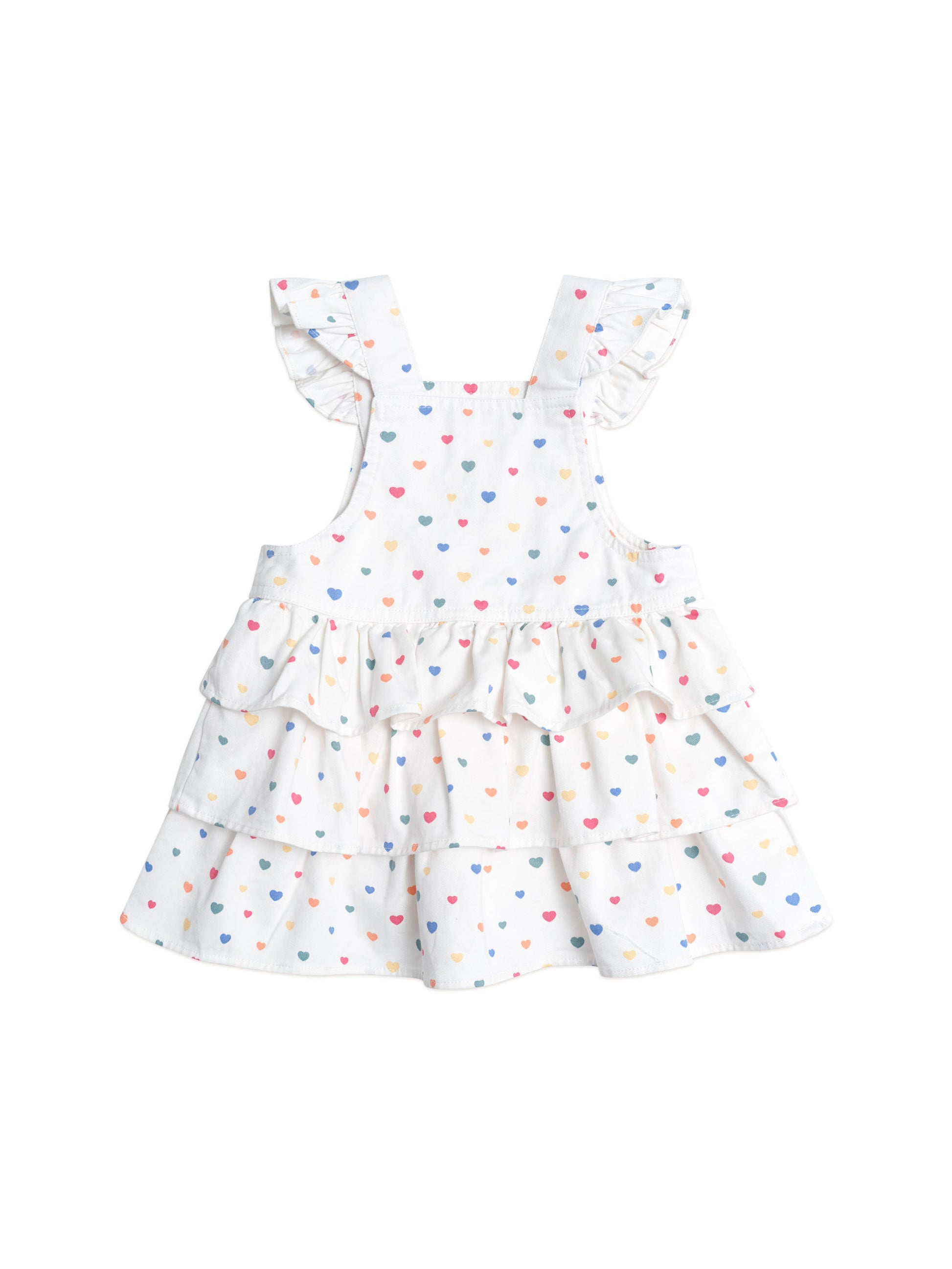 A trans seasonal overall dress made from soft cotton twill. It features playful shoulder frills and a pretty tiered skirt for comfy wear. Style it over a tee for summer or with a long sleeve top and cardi for cooler months. Designed with adjustable straps, chest pocket and a relaxed, casual fit.