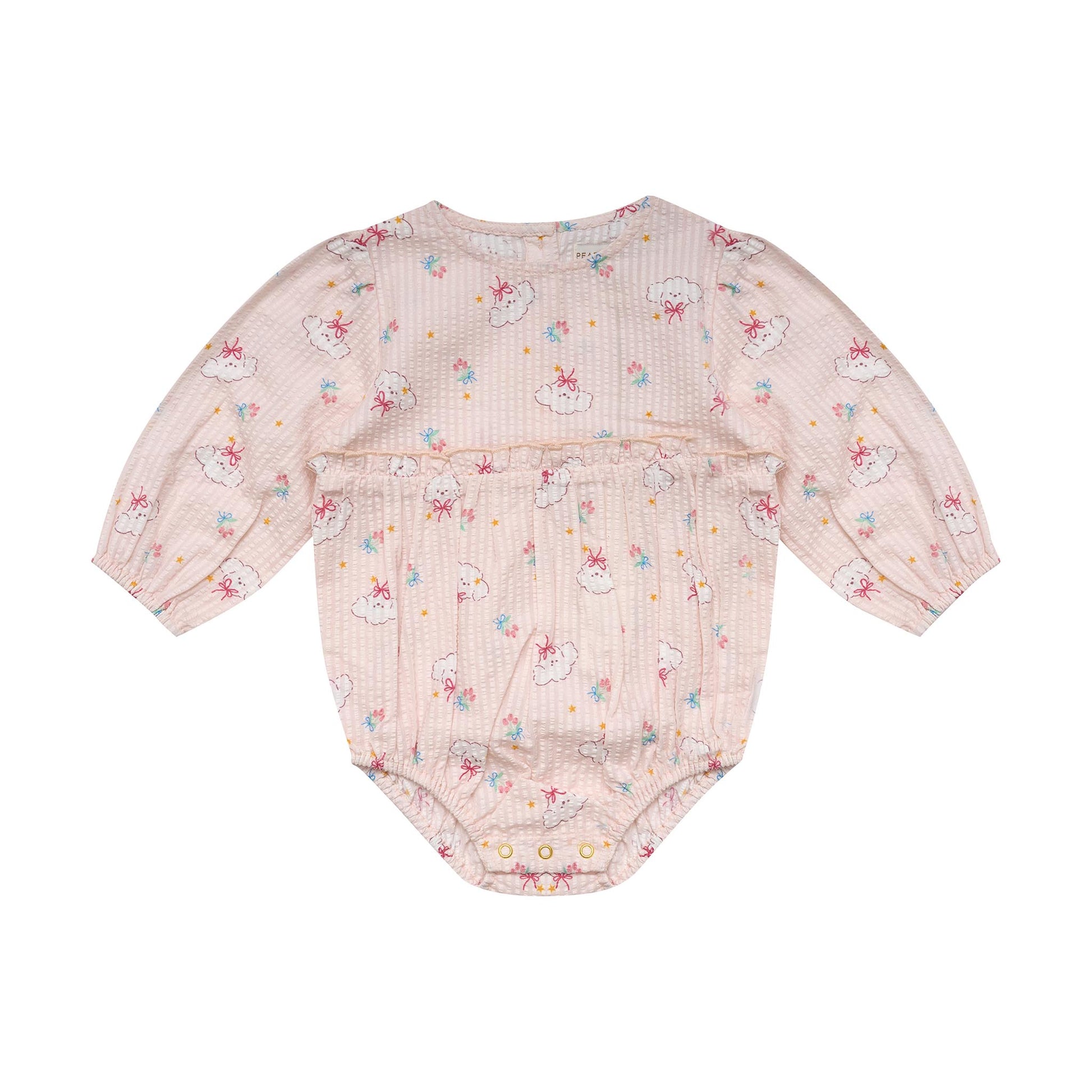 Made from soft cotton seersucker with just the perfect touch of girly charm, thisadorable piece is finished with delicate frill details. It shows off our sweetest originalStripe print and comes with elasticated cuffs, a front opening, and handy gold snapsat the crotch for quick and easy dressing and Nappy changes.