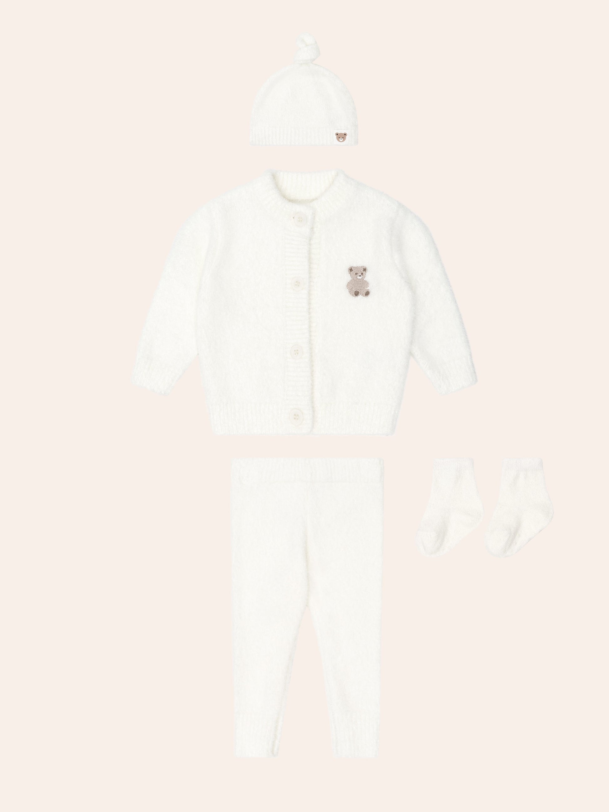 Cuteness alert. This 4-piece set comes with a cardigan, pants, socks, and a headcap. Made from the most scrumptiously soft boucle fabric, it features a stretchy waistband and baby-friendly buttons. It'll keep them cute, cosy, and cooing.