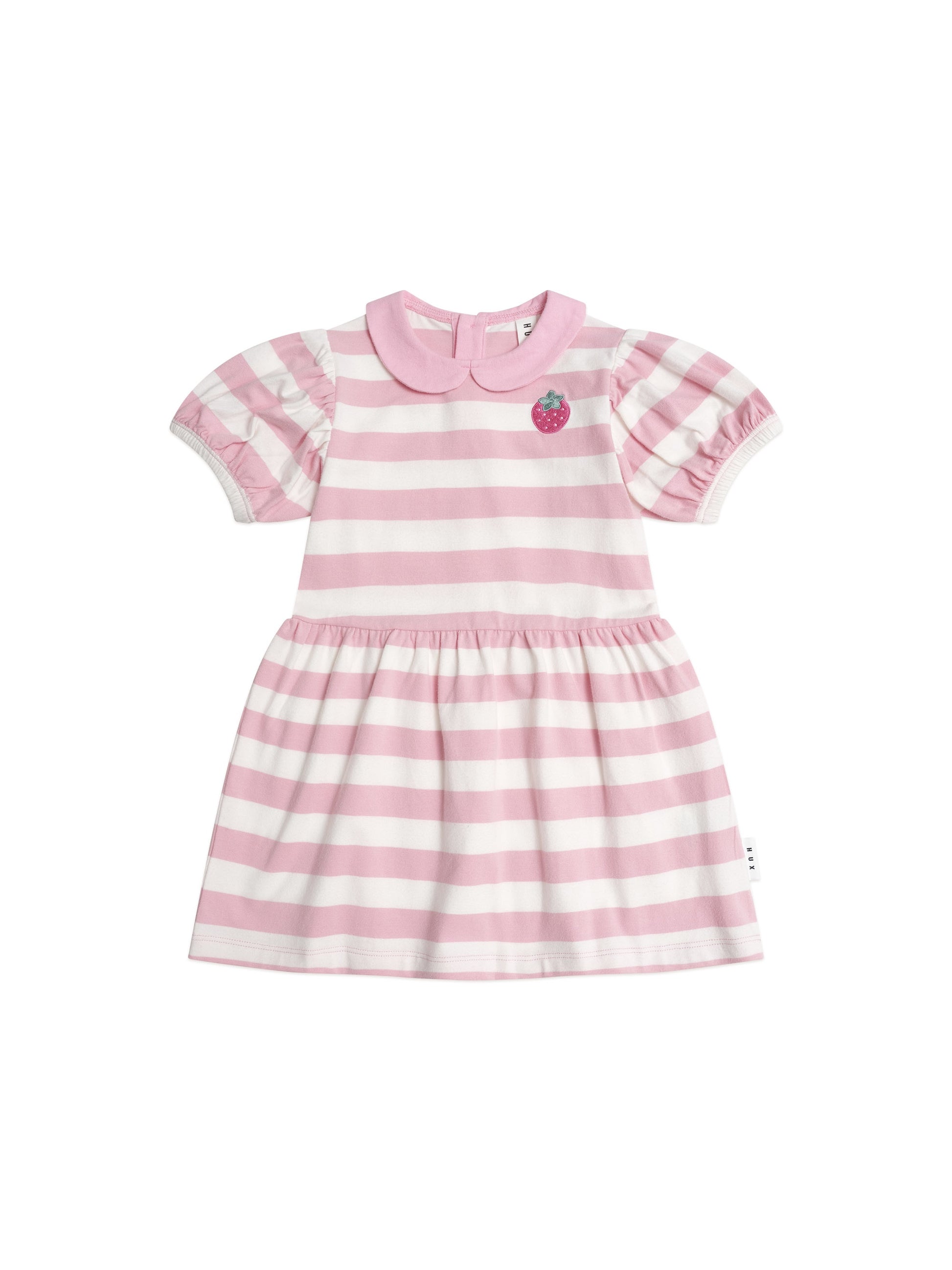 he perfect everyday dress, upgraded. Made from soft organic cotton jersey, this pretty pink number features sweet puff sleeves, a peter pan collar and an embroidered chest strawberry. Features buttons down back for easy dressing. Play the day away.